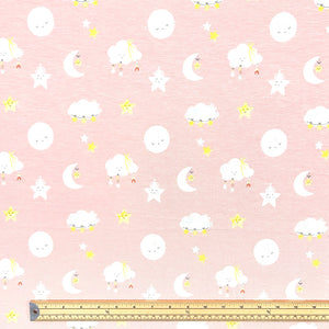 A high quality bamboo cotton blend jersey fabric featuring a stars, clouds, moon print. This fabric is breathable, soft to touch, and has a wonderful 4 way stretch, making it comfortable to wear. This fabric is perfect for making shirts, dresses, pyjamas, leggings, and more!