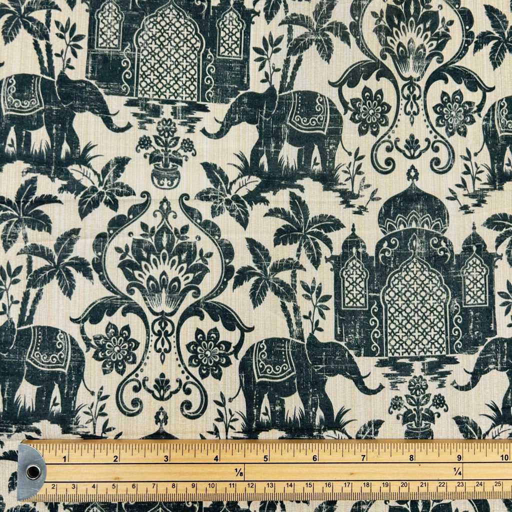 This lightweight fabric features a scenic print depicting elephants and temple-like structures. It has a beautiful drape and a soft yet slightly textured feel, mimicking the natural elegance of real silk. The blend of bamboo and viscose in this fabric gives it a silky smooth finish with a subtle sheen, while also enhancing breathability and comfort.