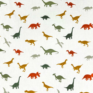 A printed, lightweight, cotton poplin fabric featuring a dinosaurs print. This fabric would be suitable for a range of dressmaking projects such as tops, dresses, and skirts, as well as quilting and crafting projects!