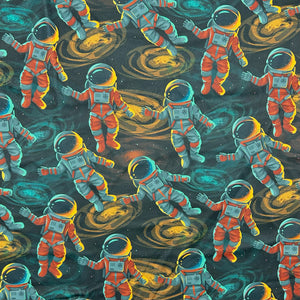 A high quality, printed sweatshirt fabric featuring an astronaut print on a black background. It has a super soft fleece-like finish on the reverse side, giving it extra comfort and warmth. This fabric has a minimal stretch across the width, and would be great for sweatshirts, hoodies, loungewear and tracksuit bottoms!