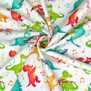 A lightweight, digitally printed, 100% cotton fabric featuring a multicoloured dinosaurs with musical instruments print on an ivory background. This fabric is suitable for a range of dressmaking and crafting projects such as dresses, skirts, tops, tote bags, and more!