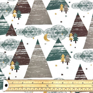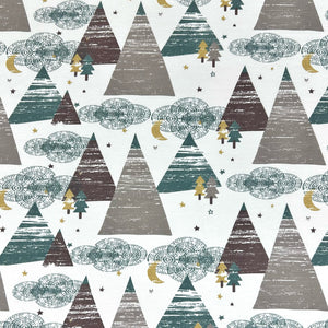 A high quality cotton jersey fabric also known as cotton lycra, featuring a mountains and trees design on an off-white/ivory background. This fabric is soft to the touch and has 4 way stretch. Suitable for tops, leggings, dresses and more!