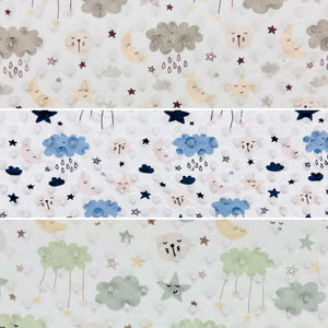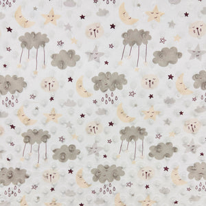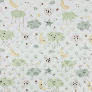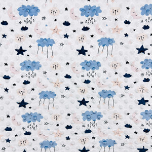 A lovely fleece fabric featuring a stars, moon and clouds print. It is cosy, soft, warm and features multiple textured dimples all over it. Perfect for a wide range of uses including baby blankets, throws, baby robes, toys, apparel, quilt backings and more! Available in 3 colours.